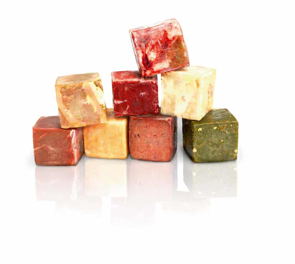 So wird auch sichergestellt, dass die Rohware keine Schilddrüsen und kein Schilddrüsengewebe enthält. Das wird auch durch externe Prüfungen regel­mäßig überwacht. Erst nach erfolgter Eingangskontrolle und Freigabe ­werden die Produkte verarbeitet und bei -48°C in hochmodernen Plattenfrostern schockgefrostet. So bleiben alle Nährstoffe erhalten. Anschließend werden die Blöcke mit einer eigens entwickelten Säge in 2,5 cm große Würfel geschnitten, dann einzeln verpackt oder zum Menü gemischt. Beim Verpacken durchlaufen alle Produkte einen Metalldetektor, um die Produktsicherheit zu gewährleisten. Natürlich gibt es auch keine Zusatzstoffe, Aromen, Lock- oder Bindemittel und keinen Zucker.
