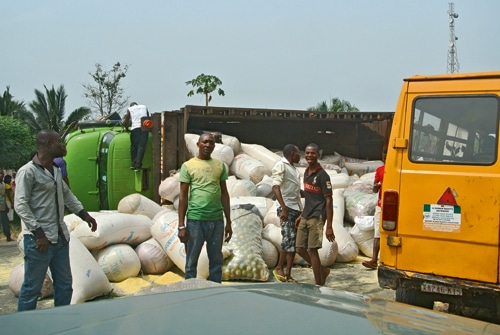 Seit Tagen schlafen wir nachts unruhig, weil wir Angst vor dem Land haben, das vor uns liegt: Nigeria. Paule scheint unsere Anspannung zu spüren. Auch er ist unruhig. Die Einreise in das berüchtigte Land klappt erstaunlicherweise weitgehend problemlos. Es war die richtige Entscheidung, einen kleinen Grenzübergang zu nehmen. Die Beamten sind nett und freundlich. Unser Hund scheint niemanden zu interessieren. Wir sind erleichtert und machen uns auf den Weg in Richtung Lagos. Nach nur zwei Kilometern müssen wir das erste Mal anhalten. Unsere Pässe werden überprüft. Zehn Meter weiter steht ein Mann vom Zoll. Danach kommt die Gesundheitsbehörde. Auf den nächsten 10 Kilometern müssen wir über 20 Kontrollen passieren. Jeder will etwas anderes sehen. Der Gesundheitsbeamte will uns weismachen, dass man kein Flaschenwasser aus dem Nachbarland einführen darf. Ein anderer will mindestens zwei Moskitonetze sehen.