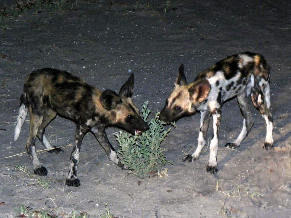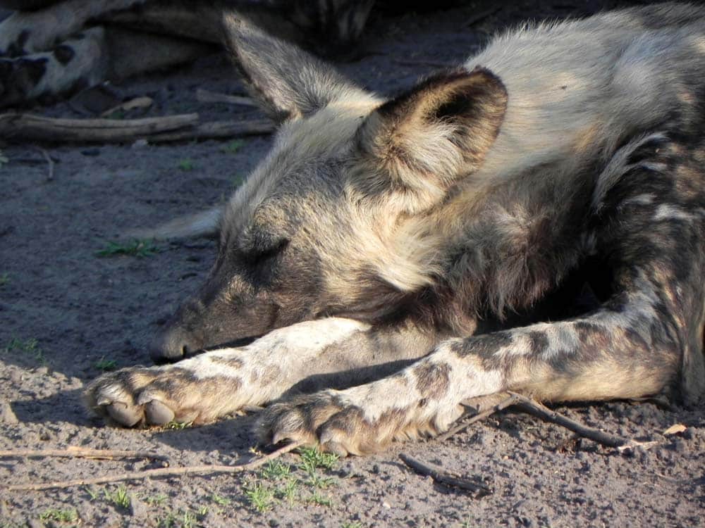 Face hat ein Lieblingstier – den Wildhund, und so konnten wir von ihm viel über diese interessanten Tiere erfahren. Schon in Kasane fielen uns das erste Mal die Straßenschilder mit der Warnung »painted Dogs« – wie in Botswana die Wildhunde auch genannt werden – auf. Nun konnten wir sie zum ersten Mal ganz aus der Nähe beobachten. Sie leben in großen Rudeln, ihre Fellfarbe ist beige-braun mit schwarzen, braunen und weißen Flecken. Kein Hund gleicht dem anderen, alle haben jedoch eine weiße Schwanzspitze.