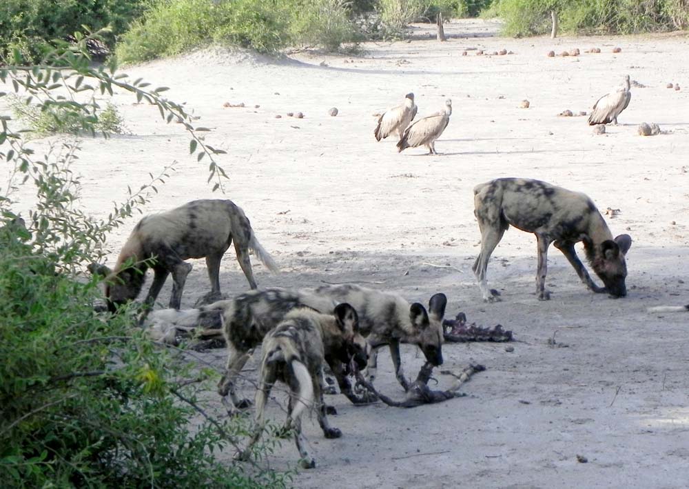 Die Afrikanischen Wildhunde sind Jäger, die aber kein Aas fressen, sondern nur Frischfleisch. Ihr Jagdverhalten ist für uns sehr grausam, denn sie reißen ihrer Beute ein Stück Fleisch heraus und verfolgen dann das verwundete Tier, bis es verblutet ist. Beachtlich ist dann auch das Fressverhalten. Wie bei kaum einem anderen Wildtier dürfen zuerst die Jungtiere fressen, und zwar so lange, bis sie satt sind – und das dauert. Die erwachsenen Tiere haben sichtlich riesigen Hunger und nähern sich immer wieder der Beute, aber die Jungen beginnen sofort zu knurren, schreien und bellen und schnappen nach den Eltern. Sie geben noch lange nichts von ihrem Stück Fleisch ab. Erst, wenn sie erschöpft mit dicken Bäuchen einschlafen, dürfen die erwachsenen Tiere zum Fressen. Aber auch da sind in zweiter Reihe schon die nächsten am Warten, was abfällt bzw. überbleibt: Die Geier. Wir sind sehr erstaunt, wie diese riesigen Vögel dasitzen und geduldig warten, bis sie an die Reste der Beute heran dürfen.