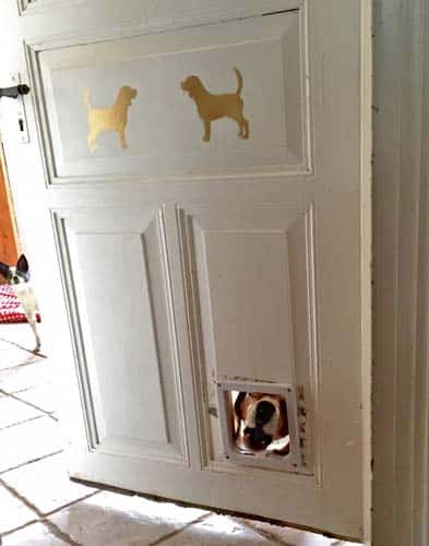 Apropos Tumor bei Andra: Zwischen all den Sorgen und Nöten, die uns genauso treffen wie jeden anderen Hundehalter, sorgen die kleinen Pleiten, Pech und Pannen, die wir ständig erleben, für eine willkommene Abwechslung und sorgen auch in schwereren Zeiten für den kleinen Lacher zwischendurch. So auch kürzlich, als es klingelte und der Postbote vor der Türe stand. Die Ankunft des Postboten ist ein Ritual: Die Hunde hören das Auto, das sie schon Kilometer entfernt erkennen, ich merke an ihrer Aufmerksamkeit, dass Post kommt, sperre die Hunde ins Wohnzimmer (dessen Türe die auf dem Foto zu sehende Katzenklappe enthält), warte, und kurz bevor es klingelt geht das Gebell los. Das dürfen sie auch, weil es mich (und den Postboten) nicht stört, wenn sie alle paar Tage einmal kurz anschlagen.
