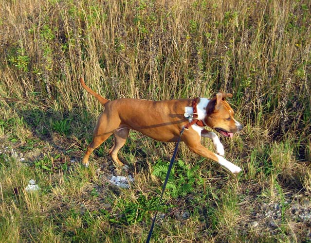 Die Folgezeit sprengte jede Dimension, was die Vorhersehbarkeit hundlichen Verhaltens angeht. Nach wenigen Wochen hatte ich kaum mehr einen Knochen im Leib, auf den ich nicht schon gestürzt war, wenn Funny urplötzlich Jagd auf ein vorbeihuschendes Irgendwas machte und ich über sie oder ihre Leine stolperte. Auf meine gezielte Nachfrage hin wurde mir erklärt, dass man Funny früher mittels Laserpointer gemütlich vom Sessel aus beschäftigt hätte. Auch die Spaziergänge wurden dereinst stets nach dem gleichen Muster gestaltet: Man fuhr ins Grüne, ließ den Vierbeiner frei und wartete so lange, bis er irgendwann wieder auf der Bildfläche erschien. Angeblich sei es unmöglich gewesen, Funny angeleint auszuführen. Dünne Leinen hätte sie sofort zerbissen, weshalb man sie mir bei der Übergabe an einem Seil präsentierte, mit dem ein Ozeanriese hätte vertäut werden können.