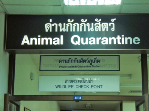 Die Einreise nach Thailand bringt keinerlei Probleme, und siehe da: neben Vega waren noch vier weitere Hunde im Flugzeug gewesen. Ein netter Hundebesitzer schenkt mir die nötigen 100 Bath für das Quarantänebüro, wo die Einreiseformalitäten für Vega abgehandelt wurden.