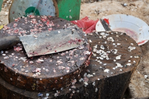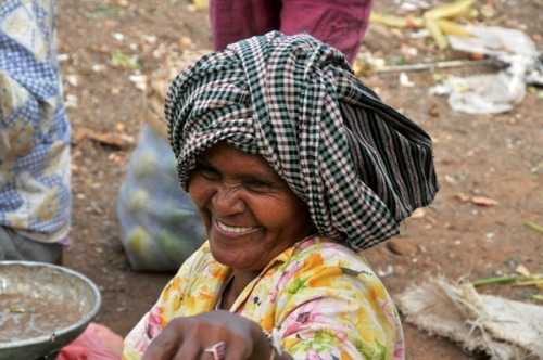 In Kambodscha habe ich jede Menge Spaß auf den Märkten, die Khmer sind freundlich und immer zu einem Späßchen bereit, auch wenn wir uns mit Händen und Füßen verständigen. Allerdings setzt das positive Gefühl erst ein, wenn man den Markt wieder verlassen hat. Denn ich sollte das Areal nur mit Gummistiefeln betreten. Ich finde immer, und das ohne Ausnahme, eine Stelle, in der Wasser mit Blut und Därmen oder anderem vermengt ein paar Zentimeter hoch steht. Und genau auf die andere Seite, da muss ich hin. Der eine oder andere Fisch, zu klein zum Verkaufen, windet sich auf dem Boden auf der Suche nach Wasser, und jedes Mal, wenn mir etwas Glitschiges über den Fuß gleitet, zwinge ich mich, nicht hinzusehen. Will nicht wieder, den Fisch in der Hand, auf dem Markt herumlaufen, um ihn zu retten. Denn selbst seine großen Kumpels darben ohne Wasser dahin. Gewöhnungsbedürftig, dass Fisch und Fleisch einträchtig nebeneinander verkauft werden, nicht auf zwei Tischen nebeneinander, sondern direkt Fleisch an Fisch oder Fisch an Fleisch. Wobei schwierig auszumachen ist, was nun Fisch und was nun Fleisch ist.