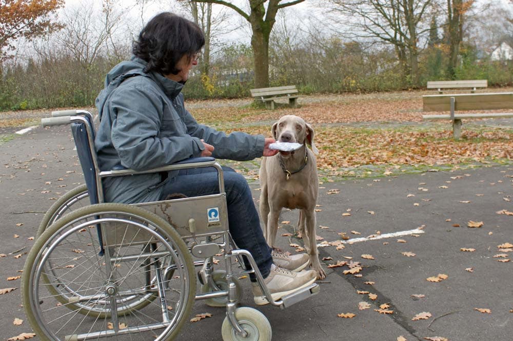 Eine der wichtigsten Aufgaben des Begleithundes eines Rollstuhlfahrers ist das zuverlässige Aufheben und Abgeben von Gegenständen. Je nach Grad der Behinderung kann ein Rollstuhlfahrer den Boden schwer oder gar nicht erreichen. Dabei sollte der Hund nicht hektisch sein, sondern den Gegenstand ruhig und zielgerichtet abgeben können. Auf ein Hörsignal, z.B. „Telefon“ oder „Halsband“, sollte der Hund in der Lage sein, den richtigen Gegenstand zu bringen, auch wenn dieser Gegenstand auf einem Regal oder einem Schrank liegt.