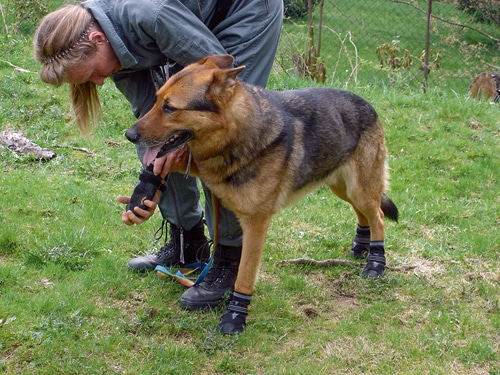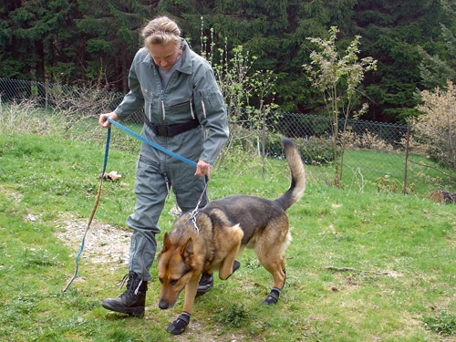 Unbeholfen staksen die Diensthunde mit ihren Schuhen auf der Wiese herum. Vielleicht ein Ball oder ein Stückchen Wurst, etwas Unterordnung oder Spiel – die Gewöhnung an die ungewohnte „Behinderung" wird jeder Hundementalität angepasst. Und schon nach wenigen Minuten laufen alle Vierbeiner – beinahe – normal neben ihren Hundeführern her. Nun können ihnen weder herumliegende Glasscherben noch Streusalz etwas anhaben.