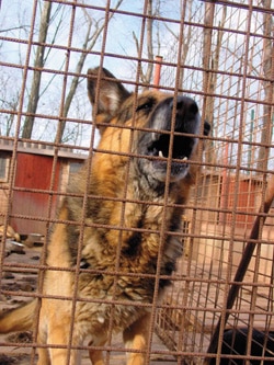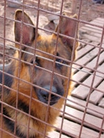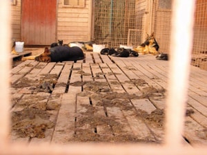Die älteren Hunde, die sich offensichtlich bereits aufgegeben haben, schleichen nur mehr still an der vorderen Zwingerseite monoton hin und her. Andere beißen in die Zwingergitter, als wir ihnen unsere Handrücken zum Beschnuppern hinhalten. Einige Hunde haben angebissene Ohren. Möglicherweise stammen diese von Raufereien oder aber von gegenseitigem „Anknabbern". Glaubt man den Verhaltensexperten, dann ist das ein typisches Zeichen einer Verhaltensstörung, wie sie bei nicht artgerechter Haltung auftreten kann.