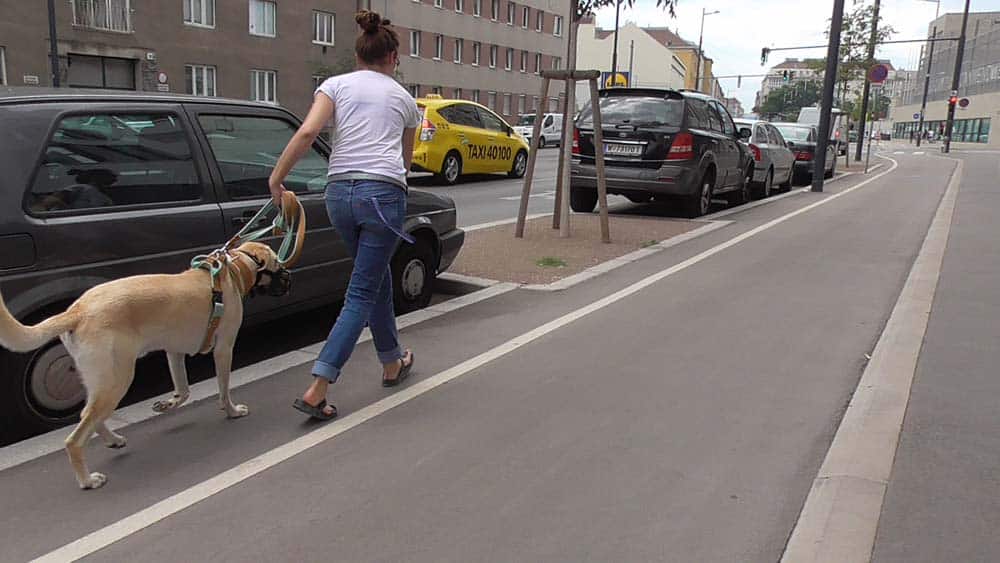 • Nicht an der Leine ziehen – und sich sofort selbst korrigieren (zum Menschenbein zurückspringen), falls dem Hund ein Fehler passiert ist.