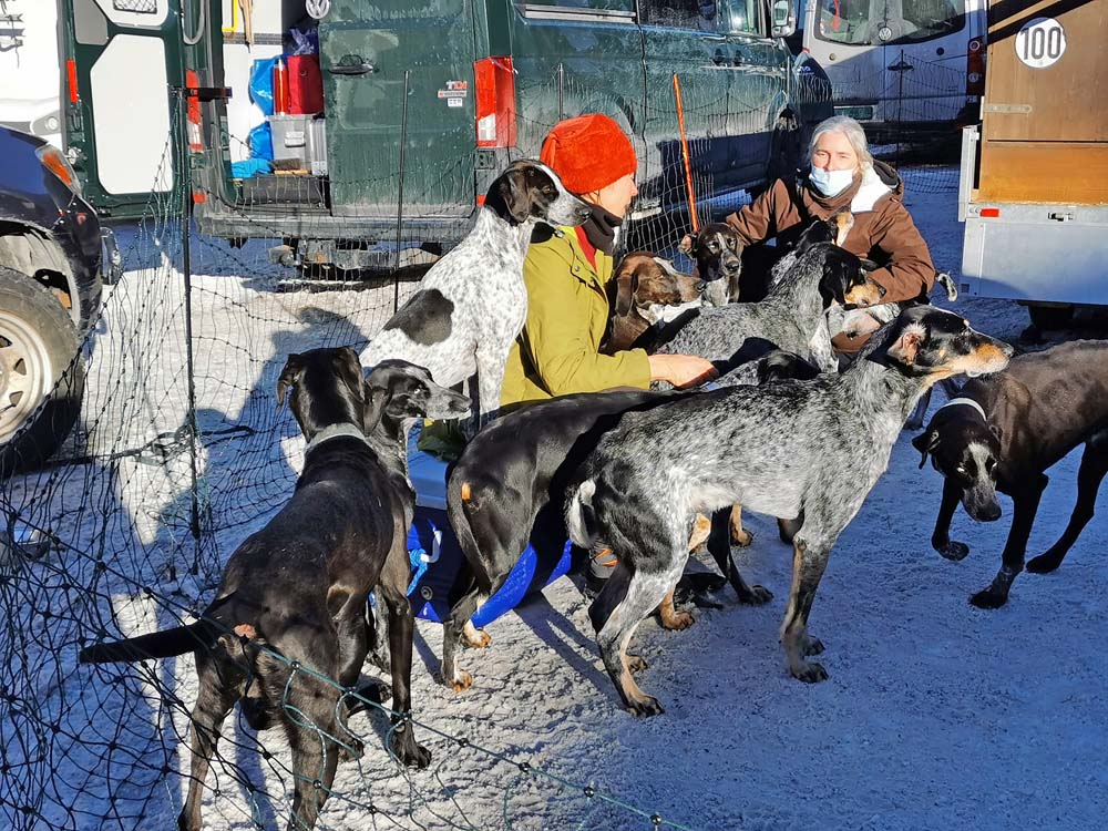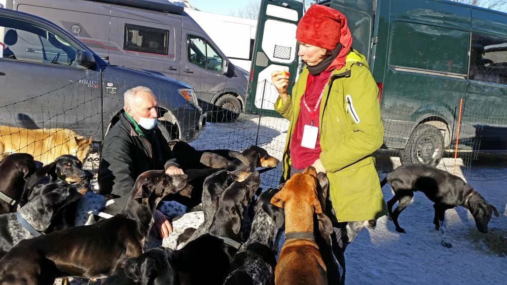 Dass zwischen den beiden Mushern und ihren Hundetruppen ein ungeheuer festes Band besteht, sieht man ganz deutlich. Beide schaffen es, ihre Meute von jeweils zwölf durchtrainierten, hoch motivierten Jagdhundmischlingen ohne Leine herumlaufen zu lassen. Auf eine kleine Handbewegung oder eine verbale Aufforderung kommen alle eilig heran und versammeln sich aufmerksam um sie herum. Was bei Sylvia ihre »Mäusekinder« sind, sind bei Heini seine »Bärlen«. Im Pulk wird dann spazieren gegangen, wobei alle Hounds an ihren Menschen regelrecht kleben. Bei diesem Anblick reibt sich nicht nur der normale Hundehalter die Augen, sondern auch der ein oder andere Musherkollege. Die beiden Deutschen sind bei der Grand Odyssée nämlich die einzigen, denen so etwas gelingt. Und das, obwohl es sich hier um jagdlich orientierte Hunde handelt, die in der Regel jede Möglichkeit ausnützen, um ihren Interessen nachzugehen.