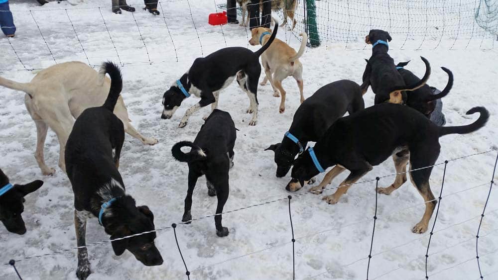 In der Regel wissen die Musher aber schon während des Rennens oder spätestens kurz danach, wer am Folgetag definitiv eine Pause benötigt. Ist einer der Hunde am Vortag im Einsatz gewesen und macht tags darauf einen erschöpften Eindruck, dann bleibt er am sogenannten Stake-out. So bezeichnet man den Platz, an dem die Musher mit ihren Hunden und Autos warten, bis sie starten dürfen. Der Name leitet sich von den Vorrichtungen ab, an denen man die Hunde an einer Kette am Auto befestigt, um sie nach der langen Anfahrt aus den Boxen zu lassen, damit sie sich lösen und gefüttert werden können. Viele Musher verzichten mittlerweile jedoch auf diese Art der Befestigung und verwenden stattdessen einen Schafszaun, den sie um ihr Auto herum aufbauen, sodass die Hunde während des Wartens wenigstens ein wenig Auslauf haben. Sylvias und Heinis Hunde haben sich bei diesem Rennen einen eingezäunten Bereich geteilt, auch wenn es bei 24 frei laufenden Hunden schon mal schnell eng werden kann.