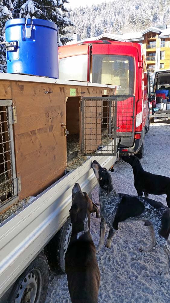 Eng mag es für Außenstehende auch in den Boxen zugehen, in denen die Hunde Hunderte von Kilometern transportiert werden und nachts schlafen. Vorbehalte, die Art der Unterbringung sei zu klein, zu kalt oder gar ein Albtraum für alle Hunde, wird niemand erheben, der es einmal erlebt hat, wie gerne die Hunde in ihre Boxen zurückkehren. Wer am Morgen trotz eisiger Nachttemperaturen beim Öffnen der Gittertür den Kopf in so eine mit Heu ausgelegte Box gesteckt hat, weiß, dass man sich als Hund hier einfach wohlfühlen muss. Es herrschen mollige Temperaturen, um die ich die Hundetruppe während des vielen Wartens auf den meist im Schatten gelegenen Stake-outs beneidet habe. Bei Sylvia und Heini liegen zudem immer zwei Hunde zusammen in einer Box, und mit dieser »Doppelheizung« wird es in den Boxen so warm, dass man auch bei empfindlichen Minusgraden in der Nacht die Luken beziehungsweise die Fenster der Autos offen lassen muss. Ansonsten wäre es viel zu warm für die Hounds. Und das, obwohl an ihnen kein Gramm Fett zu viel ist.