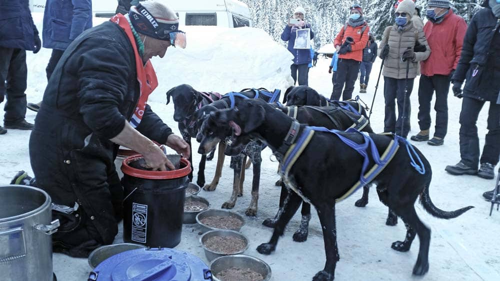 Was die Ernährung der Hunde anbelangt, so hat hier jeder Musher seine eigene Vorstellung und sein eigenes Rezept. Selbst die Fütterung von Sylvia und Heini unterscheidet sich – sowohl in der Menge als auch in der Zusammensetzung. Wichtig ist, dass die Hunde, die eingespannt werden, genügend Proteine zur Verfügung haben. So bekommen beide Rennteams eine gute Stunde vor dem Start eine Art fleischige Suppe, damit sie viel Flüssigkeit und nochmals viele Proteine und Kohlenhydrate aufnehmen, um ihre Energiedepots aufzufüllen. Kurz vor dem Anlegen der Zuggeschirre, also unmittelbar vor der Etappe, gibt es dann nochmals ein wenig Flüssigkeit mit Fleischgeschmack, damit die Hunde es auch auf jeden Fall zu sich nehmen. Bietet man ihnen reines Wasser an, besteht die Gefahr, dass sie es nicht trinken. Flüssigkeitsmangel während des Rennens aber wäre fatal.