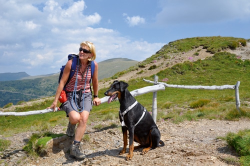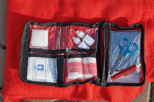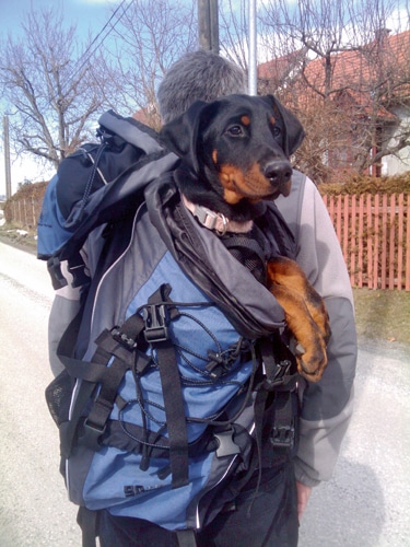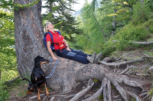 Ihre Erste-Hilfe-Apotheke im Rucksack sollte an die Erfordernisse des Hundes angepasst und ergänzt sein. Im Fachhandel gibt es bereits speziell abgestimmte Erste-Hilfe-Pakete für Hunde, wobei allerdings manche der aufgenommenen Utensilien eher als modische Accessoires anzusehen sind und nur Gewicht und Platz verbrauchen. So können Sie, falls vorhanden, doppelte Dinge wie Scheren, Pinzetten etc. aus Gewichtsgründen entfernen. Sehr gute Dienste leisten Multifunktionsmesser, die für kleine Reparaturen an der Ausrüstung notwendig sind. Zeckenzangen, ein passender Pfotenschutz und einige Leckerlies zur Belohnung sind zumeist als Erste-Hilfe-Set ausreichend. Bewährt hat sich bei längeren Wanderungen und bei Touren im Winter wasserabweisende Schutzbekleidung für den Hund, wobei wir mit unserem Hund, einem Dobermann, eine eher kälte- und wasserempfindliche Rasse haben. Der erhöhte Energieaufwand bei anstrengenden Touren sollte schon während der Wanderung durch spezielles hochenergetisches Futter für den Hund ausgeglichen werden. Hier gibt es gut portioniertes und handlich verpacktes Trockenfutter im Fachhandel, das sich leicht im Rucksack verstauen lässt.