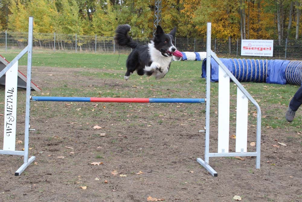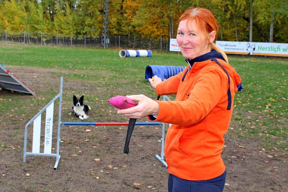 Christina Hahnel und Hündin Fly führen auf dem Foto ein Startritual aus, denn Fly startete beim Agility oftmals zu zeitig, wie es ihre Halterin beschreibt. Flys Erregungslevel war am Startpunkt so hoch, dass sie sich nicht mehr auf die Signale von ihrer Hundeführerin konzentrieren konnte. Oder anders formuliert: Das so genannte »Blaue Fenster« beschreibt stufenweise das jeweilige Erregungslevel, in dem ein Hund noch lernen könne. Bei zu hoher Erregung kann der Hund nicht mehr lernen, bei zu niedriger aber auch nicht. Seit einiger Zeit greift deshalb bei der Hoyerswerdaer Hundefreundin eine weitere Methode aus dem Konzept »Blauerhund«. Mit der Einführung eines Rituals konnte das Verhalten der Hündin somit positiv und sehr erfolgreich beeinflusst werden. »Auf einem Seminar bei Rolf Franck haben wir diese individuelle Startsequenz erarbeitet. Fly liegt dabei ruhig am Start. Für ihr ruhiges Verhalten erfolgt der Click und das Spielzeug wird zum Hund geworfen. Damit wird die ruhige Liegephase gegenüber dem Losrennen in den Agility – Parcours aufgewertet. Somit halten sich nach längerem Training der Sequenzen beide Motivationen die Waage: Das ruhige Abwarten oder das Starten dürfen«, erklärt Christina Hahnel.