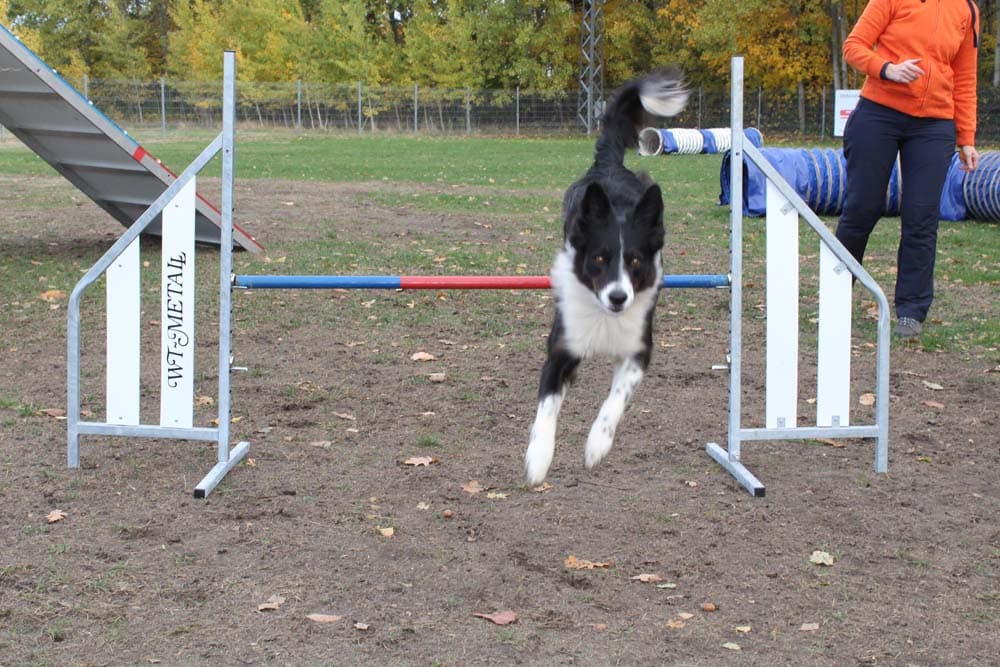 Fly springt, wie auf dem Foto zu sehen, voller Freude über die Hürde. Auch das exakte Einhalten des Startrituals mindere nicht ihre Arbeitsfreude, erklärt Christina Hahnel. Es sei ein wichtiger Bestandteil des Konzeptes »Blauerhund«, dass die Tiere unbedingt Freude bei der Arbeit haben sollen. So würden negative Einwirkungen während des Trainings komplett ausgeschlossen. Es sollen keine Motivationsbremsen im Training entstehen, denn der Hund soll sich frei entfalten können mit der Gewissheit, dass Training für ihn keine negativen Konsequenzen hat. Sollte der Hund Fehler machen, dann könne eine Fehlermeldung, aber kein hartes Abbruchkommando gegeben werden. Die Fehlermeldung sollte ein Wort oder Laut sein, welches dem Hund lediglich mitteilt, dass das gezeigte Verhalten nicht hundertprozentig das Gewünschte war. Diese Fehlermeldung soll den Hund aber gleichzeitig auch motivieren, mehr positives Verhalten anzubieten und weiter an der Übung zu arbeiten