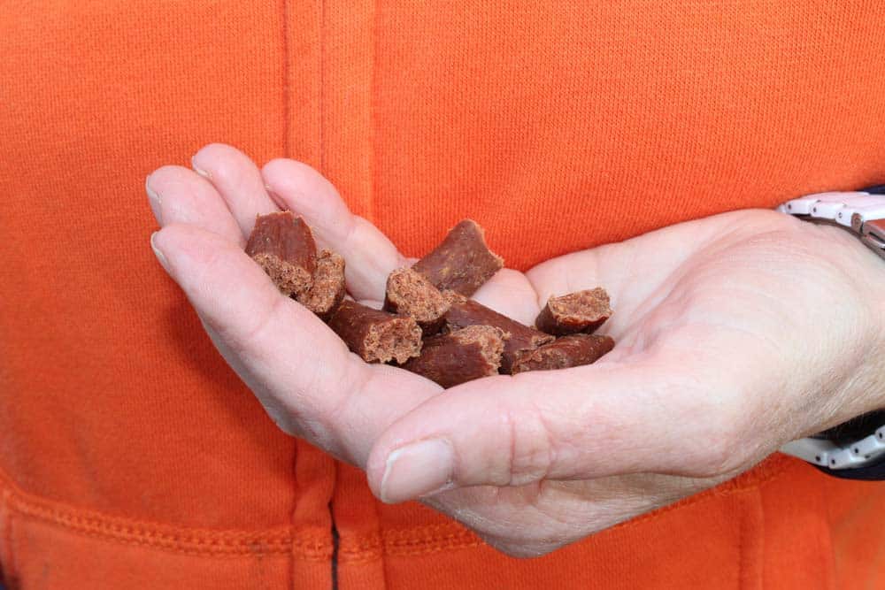 Geschmackvolles Futter ist hierbei sehr wichtig. Damit die Konditionierung des Clickers gut gelingt, sei eine sehr hohe Belohnungsrate von wesentlicher Bedeutung. Dafür eignen sich kleine Futterstückchen am besten, die der Hund schnell kauen und schlucken könne. »Und natürlich sollen sie für den Hund auch etwas ganz Besonderes sein. Das Futter, welches der Hund jeden Tag in den Napf bekommt, eignet sich dafür weniger«, so Trainerin Christina Hahnel. Es müsse quasi ein Privileg für den jeweiligen Hund sein, diese besondere Belohnung bekommen zu dürfen. Angefangen von Trockenfleisch, Wurst, Käse bis hin zu Trockenfisch sei auf der Liste alles erlaubt, was dem Hund magentechnisch gut bekommt.