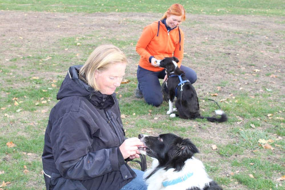 Um optimale Bedingungen für ein effektives Training zu erreichen, sollte der Hund sich auf seinen Menschen konzentrieren können und er sollte motiviert sein, arbeiten zu wollen. Dabei muss er Umweltreize, andere Hunde, Menschen und Ablenkungen ausblenden können. Als Einstieg in ein Training ist es deshalb von Vorteil eine entspannte Atmosphäre zu schaffen und den Hund auf sich zu fokussieren. Wie hier auf dem Foto zu sehen hocken sich dafür Corinna Fornfeist (im Vordergrund mit Malik) und Christina Hahnel (im Hintergrund mit Chelsea) vor ihren Hunden hin und lassen sie an einem Leckerli knabbern. Es ist eine Einstimmung auf das bevorstehende Training, quasi um das Wohlfühlbudget des Hundes zu erhöhen.