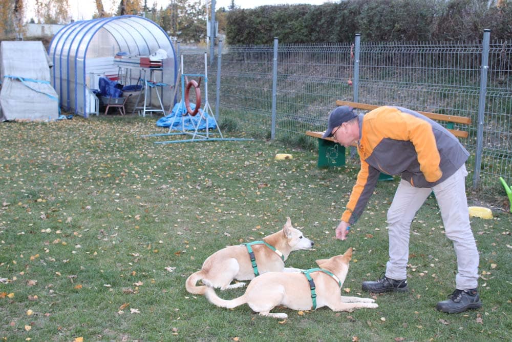Hier ist Lars Tippmann mit Amara und Falco zu sehen. Im Intervalltraining erarbeitet der Hundetrainer in drei verschiedenen Phasen das Kommando »Platz«. Nach der ersten Phase, der Motivation, ist hier die zweite Phase, die Ausführung der eigentlichen Übung zu sehen. Durch die hohe Motivation vor der Übung zeigen beide Hunde gern die gewünschte Position. Dafür bekommen sie von ihren Haltern überschwängliches Lob und jede Menge Clicks in dieser Position. Anschließend erfolgt die dritte Phase des Intervalltrainings, die Auflösung (Frustration) der Übung. Dazu sagt der Hundeführer sein Auflösungswort, welches die Übung beendet. Dieses Wort wird eher neutral und belanglos ausgesprochen. Der Hund soll damit die Platz-Position verlassen. Damit der Hundeführer kein körpersprachliches Signal geben muss, könne man den Hund ganz sanft und ruhig mit der Leine aus der Position bringen. Nun erfolgt eine neutrale und eher schnöde Ruhephase für den Hund. »Das soll für den Hund eher langweilig sein, damit er sich viel lieber in die schöne Übungssequenz zuvor zurückwünscht«, erklärt Lars Tippmann das Grundanliegen. Nach der langweiligen Pausenphase beginnt das Intervalltraining von vorn mit allen drei Phasen. Der Hund wird sich immer öfter in die Übungsphasen wünschen und somit zu einem hochmotivierten Partner werden, so das Fazit der Hoyerswerdaer Hundefreunde.