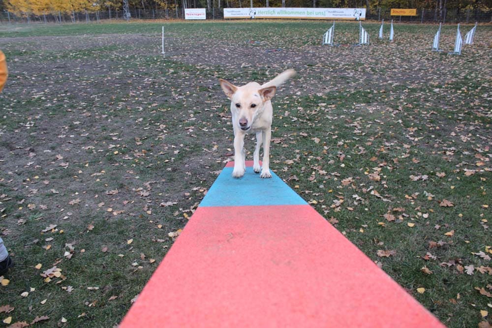 Im Agility ist das Training der Einzelgeräte sehr wichtig. Der Hund muss erst jedes Gerät wirklich verstanden haben und mit ihm arbeiten können, bevor es in den entscheidenden Parcours geht. »Gerade hier kommt uns das Konzept »Blauerhund« sehr zu Gute. Denn jeder Hund soll Spaß am Training haben«, meint Corinna Fornfeist. Das emotionale Training dieses Konzepts vermittle Hunden grundlegende Freude bei der Arbeit. Das Wohlfühlbudget des Hundes sei damit soweit aufgefüllt, dass der Hund auch schwierige Aufgaben schaffen könne, wie es auf dem Foto mit der Wippe zu sehen ist. Die Wippe ist ein recht schwieriges Gerät für den Hund, daher müsse diese Übung sorgfältig und mit vielen positiven Erlebnissen aufgebaut werden. Auch hier könne das Intervalltraining hervorragend angewendet werden. In der ersten Phase wird der Hund für die Aufgabe motiviert, gefolgt von dem wünschenswerten Gefühl, dass es für den Hund auf der Wippe genial ist. In der dritten Phase soll der Hund das Verlassen der Wippe schnöde und langweilig finden.