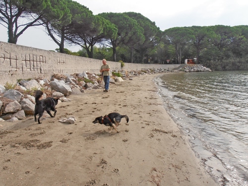 Nun sollte es aber doch ans Meer gehen und wir fuhren nach Grado und hielten am Campingplatz in Aquileia. Auf dem Weg dorthin hielten wir in Belvedere am Strand. Piccolina und Timo hatten ihren Spaß daran durch den Sand zu toben. Das Salzwasser und die Wellen waren ihnen anfangs nicht so ganz geheuer, aber bald lief Timo einfach rein ins Meer. In der Stadt Grado kaufte ich dann gleich mal Wasser für unsere Fellnasen. In den Brunnen sprudelt nämlich leider kein Trinkwasser. Eine Kottüte wurde zum Wassernapf, und während mein Mann und ich Eis aßen, tranken unsere 8 Pfoten „aqua minerale naturale".