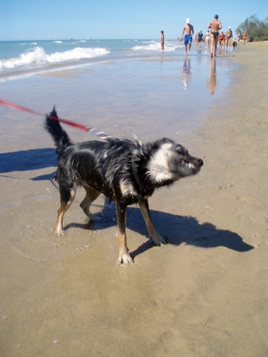 Die darauffolgenden Tage verbrachten wir mit Ausflügen nach Villach und Millstatt. Und weil wir schon „im Süden“ waren, zog es uns am dritten Tag nach Bibione an den Hundestrand. So wie viele andere Hunde genossen es auch unsere beiden, im Sand herum zu toben, und Timo badete auch ausgiebig. Nach zwei Stunden war er total müde und schlummerte unter dem Sonnenschirm. Piccolina hatte sich schon früher einen schattigen Platz im Gestrüpp gesucht. Zurück am Hafnersee tauchten wir mit den Hunden gleich noch in den See. So waren sie Sand und Salz aus ihrem Fell auch wieder los.