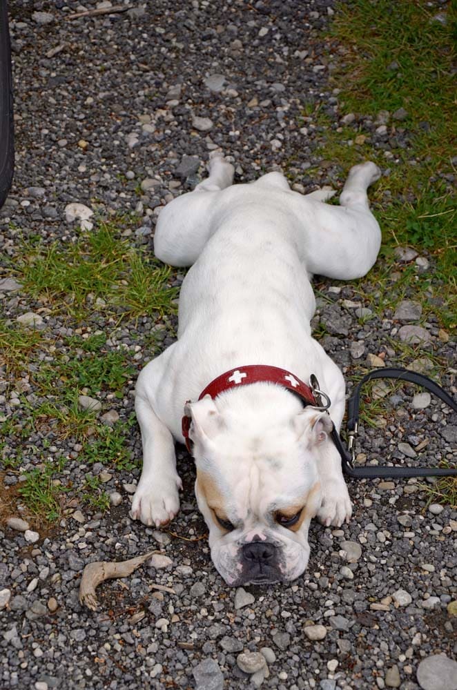 Der veranstaltende Verein war aber der Continental Bulldog Swiss Club (CBSC). Neben den sehr sympathischen ­Hunden sind mir auch deren sympathische Leinenhalter aufgefallen, was ja nicht immer der Fall ist. Bei so manchen anderen Rasse-Treffen kommen einem ja manchmal ganz arge Gestalten unter. Als Erstes ist mir aufgefallen, dass ausnahmslos alle Contis freundlich gegenüber jedermann sind und sich – sobald man sich hinhockt – mit voller Körperkraft herdrücken. Das gefällt mir wirklich gut. Das bekannte tolle ­Bulldog-Wesen in gesunden Körpern. Was will man mehr?