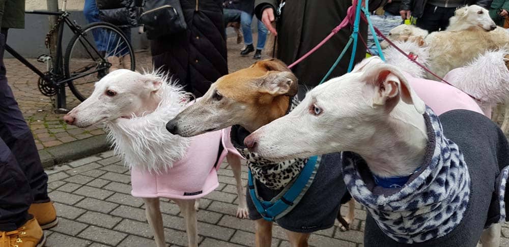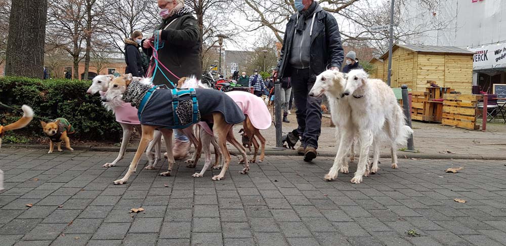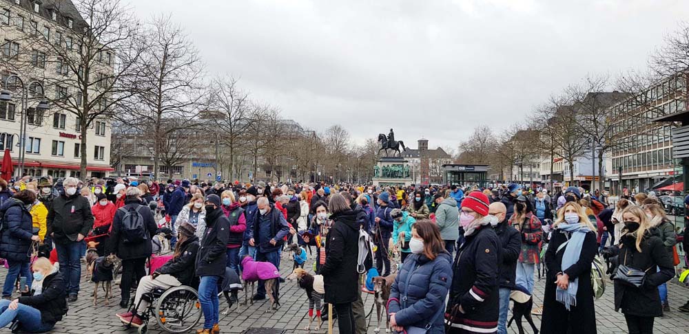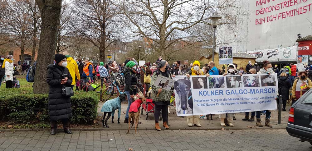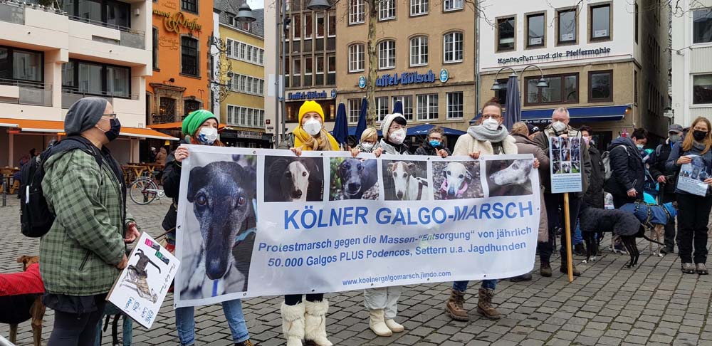Im Januar trafen sich nun zum bereits siebten Mal 700 Zweibeiner mit ihren 2.000 Vierbeinern zum »Kölner Galgo-Marsch«, um vom Bürgerhaus Stollwerck aus durch die Kölner City bis zum Heumarkt zu marschieren. Der Marsch fand statt, um auf die teils katastrophalen Haltungsbedingungen der spanischen Windhunde (Galgos) und ihrer Leidensgenossen – Podencos, Setter, Bodegueros, Bretonen u.v.a. – , die in Spanien traditionell zur Jagd benutzt werden, aufmerksam zu machen.