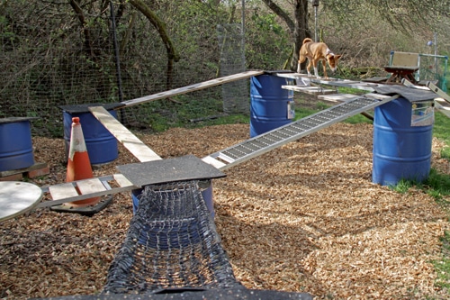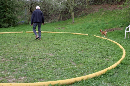 So werden Positionsübungen wie „Sitz“, „Platz“ und „Steh“ nicht als solches isoliert trainiert, sondern in Verbindung mit Longieren, Parcours-Arbeit und dem Arbeiten an Agilitygeräten mit anschließender Belohnung aus dem „Fell- bzw. Futterdummy“ an der Reizangel.