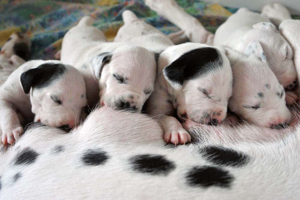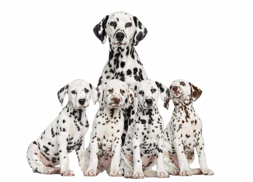 Alle Dalmatinerwelpen werden weiß geboren. Sind sie von der Geburt noch nass, können vereinzelt kleine Tupfen, vor allem an Kopf und Ohren, von erfahrenen Züchtern als schwarz oder braun erkannt werden. Sehr gut sichtbar hingegen sind bei neugeborenen Dalmatinern größere Farbflächen, vor allem am Kopf, an den Ohren oder um die Augen, eher selten an anderen Körperregionen. Man nennt diese (zuchtausschließenden) Pigmentansammlungen „Platten“ oder „Monokel“; sie können bei allen Farbschlägen (weiß-schwarz, weiß-braun, lemon oder orange) vorkommen. Im Alter von 2 ½ bis 3 Wochen haben sich gut erkennbare schwarze oder braune Tupfen entwickelt. Am meisten verbreitet ist der weiß-schwarze Typ mit schwarzer Nase, aber auch die weiß-braunen („havannabraun“) Dalmis mit brauner Nase und helleren Augen haben ihre Liebhaber. Beide Farbtypen sind vom offiziellen Standard zugelassen.