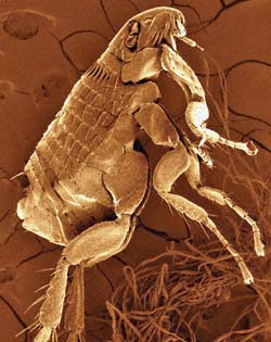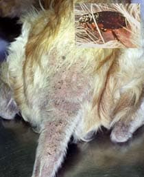 Sofort nach dem Schlüpfen aus seinem Kokon sucht sich der jetzt etwa 2,5 mm lange Floh ein passendes Opfer. Sowohl weibliche wie auch männliche Flöhe beißen und saugen Blut, um sich selbst und ihre Nachkommenschaft zu versorgen. Das erwachsene Flohweibchen kann während der „aktiven Flohsaison" mehrere Monate alt werden oder – bei schlechten Umweltbedingungen – noch älter, während das Flohmännchen nur etwa halb so alt wird. Die Anzahl der Eier, die ein Flohweibchen während seines Lebens legen kann, variiert zwischen 30 und 50 Eiern pro Tag (!), und dies über mehrere Monate. Multiplizieren Sie die Zahl der Floheier mit der Zahl der weiblichen Flöhe auf Ihrem Hund (2/3 der Flöhe, die Sie auf Ihrem Tier finden, sind weiblich) und diesen Wert dann noch mit der Anzahl der Tage mehrerer Monate, dann werden Sie das richtige Ausmaß des Flohproblems verstehen.