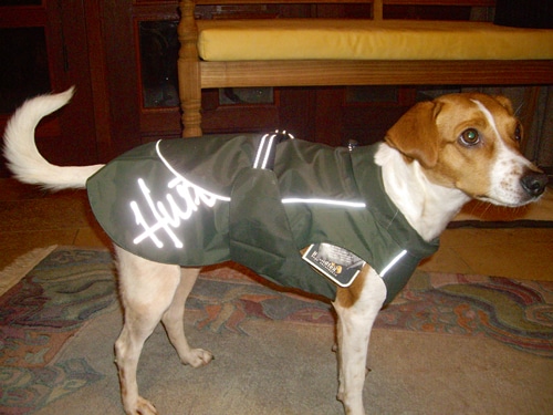 Für nicht so kalte, aber nasse Tage besorgte ich für Lille einen Regenmantel der Firma Hurtta (Foto 10). Er ist ungefüttert und hat einen unter dem Bauch durchgeführten Latz, der auf dem Rücken mit einem Gurt verschlossen wird. Er funktioniert gut mit Haltebändern für die Hinterbeine, hat aber leider wieder keine Öffnung für das Brustgeschirr, was ich bei einem so hochpreisigen Modell als Minuspunkt empfinde.