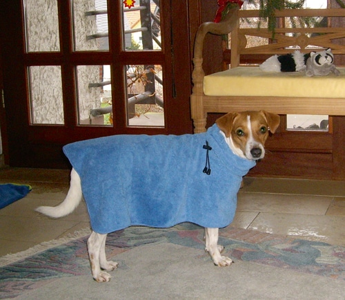 Zum Abschluss möchte ich noch einen kleinen Einblick in die Intimsphäre einer Kromfohrländerhündin geben: Das Bademäntelchen. Bei nassem Wetter muss der Hund nach dem Gassigehen unten herum abgespült werden, sonst hat man überall in der Wohnung den feinen Sandschmutz. Damit sich Lille danach nicht erkältet bekommt sie das Bademäntelchen über (Foto 11). Sie sieht darin zwar aus wie ein mittelalterliches Streitross, doch es erfüllt seinen Zweck. Sitze ich beim Kaffee, liegt Lille warm unter einer Decke und trocknet vor sich hin.