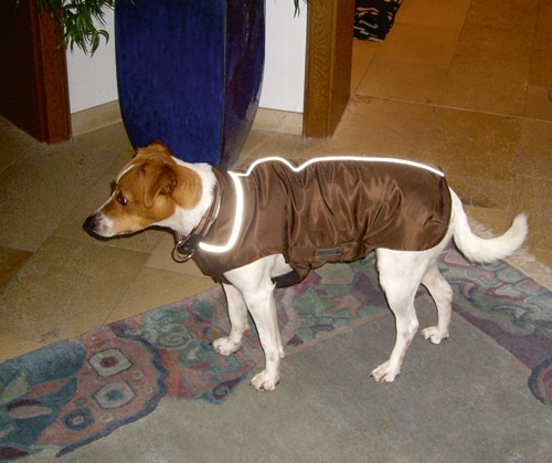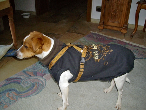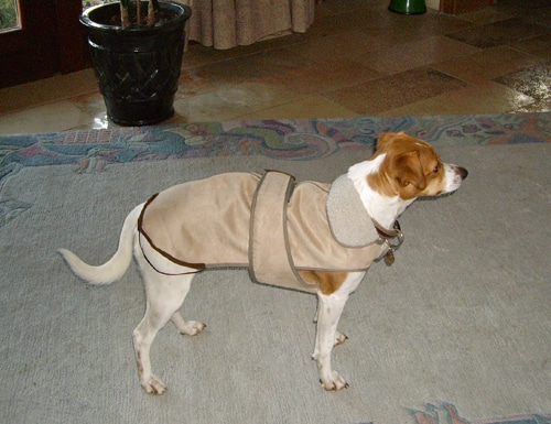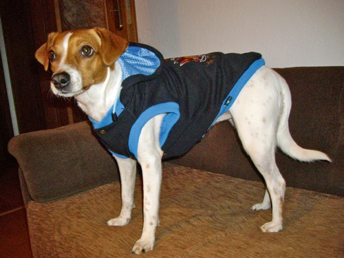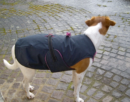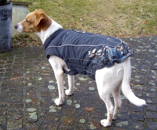 Der nächste Versuch (Foto 4): Ein maßgeschneidertes Mäntelchen einer Firma, das man über das Internet bestellen kann (hundumschick.de). Außen Anorakstoff und innen leichter Fleece erschien mir ideal, zumal der Schnitt ganz einfach und leicht zu handhaben war. Jedoch rutschte der Gurt, der den am Rücken liegenden Latz unter dem Bauch fixieren soll, immer bis fast an den Hals nach vorne und der Rest des Mantels zur Seite. Da konnten auch die um die Hinterbeine angebrachten Gummis nichts daran ändern. Allerdings hatte dieser Mantel im Vergleich zu den bisherigen einen großen Vorteil. Er hatte auf dem Rücken eine Öffnung zum Einhaken des Geschirrs. Ich verbesserte das Produkt, indem ich eine Führungsschleife für den Gurt und zwei offene Abnäher am Hinterteil des Mantels anbrachte. Nun funktioniert es gut.
