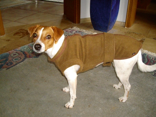 Die nächste Anschaffung war ein sehr günstiges Fleecemäntelchen (Foto 2). Es hatte über den ganzen Rücken einen Reißverschluss. Doch schon nach kurzer Zeit war der kaputt, er klaffte. Ich bestellte ein zweites Modell und nähte aus den Resten des ersten einen Gürtel, den Lille um die Taille trug. So war die Hündin auch am Bauch warm verpackt und alles lag schön an. Aber Lille legte weiter an Gewicht zu, und nun wurde dieser Mantel recht eng um die Brust.