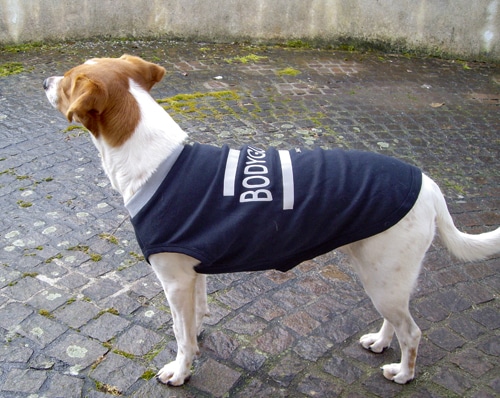 Von derselben Firma besitzen wir inzwischen noch ein weiteres Fleecemäntelchen mit Rollkragen (Foto 7), ein cooles Bikershirt mit festknöpfbarer Kapuze aus Fleece, der aber außen wie ein Shirt-Stoff aussieht (Foto 8) und ein leichtes Shirt mit der Aufschrift „Bodyguard" (Foto 9). Die Modelle dieser Firma sitzen bei Lille bei richtig gewählter Größe prima.