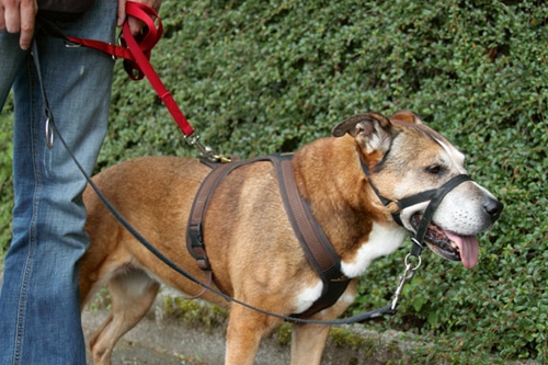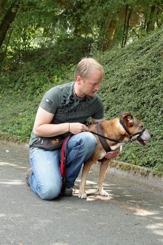 Angepasst an die Bedürfnisse und Befähigungen des Hundeführers und an den Charakter und die ­Intensität des aggressiven Verhaltens des ­Hundes kommen hier wieder mehrere „Zwangseinwirkungen“ in Betracht. Bei vielen Hunden reicht ein neu konditioniertes verbales Abbruchsignal wie „Lass es“ oder „Schluss“ völlig aus. In anderen Fällen ist die kurze und impulsartige Einwirkung über das Kopfhalfter denkbar. Auch ­körperliche Abbruchsignale wie z.B. kurzes An­-