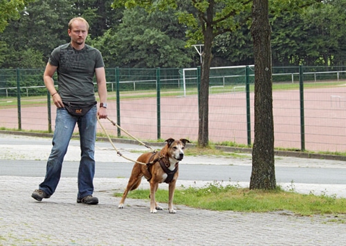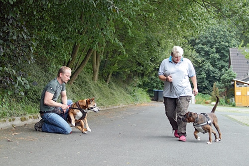 Im Anschluss an diese ersten Übungen in möglichst reizarmer Umgebung folgen dann gemeinsame Spaziergänge. Der unverträgliche Hund wird hierbei mit etwas Abstand hinter (!) dem sozial verträglichen Hund geführt. Durch diese anhaltende Auseinandersetzung mit dem Konfliktherd fremder Hund erreicht man beim zu therapierenden Hund eine ständige Erhöhung der Reizschwelle und eine Gewöhnung an den fremden Hund. Hierbei darf man auch nicht vergessen, dass ­Hunde nur bis zu einem bestimmten Alter anhand weniger Erfahrungen, egal ob positiv oder negativ, generalisieren können. Im fortgeschrittenen Alter erreicht man eine Generalisierung beim Hund teilweise nur durch häufig wiederkehrende ähnliche Erfahrungen. Das kann bedeuten, dass sozial unverträgliche Hunde an jeden „neuen“ fremden Hund aufs Neue gewöhnt werden müssen.