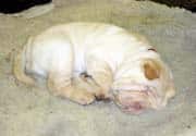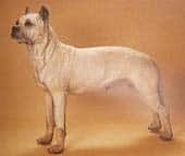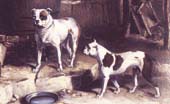 Eine recht unglückliche Entwicklung hat die Englische Bulldogge durchgemacht. Sicher trauert niemand den einstigen „Bull-Baitings" nach, doch die Hunde waren damals beweglich und ausdauernd, wie uns das Bild der beiden Bulldoggen Crib und Rose (Abb.) zeigt, die als die Stammeltern der heutigen Bulldogs gelten. Noch 1930 war der Bulldog ein recht beweglicher Hund mit einem zwar schon kurzen, aber im Einklang mit der Körperform stehenden Schädel. Ein Hund mit dieser Schädelform hat heute auf einer Ausstellung keine Chancen mehr. Die Abbildung zeigt, wie ein heutiger Siegerhund aussehen muss. Dem kurzen Gesichtsteil entspricht dann eine starke Faltenbildung im Gesicht.