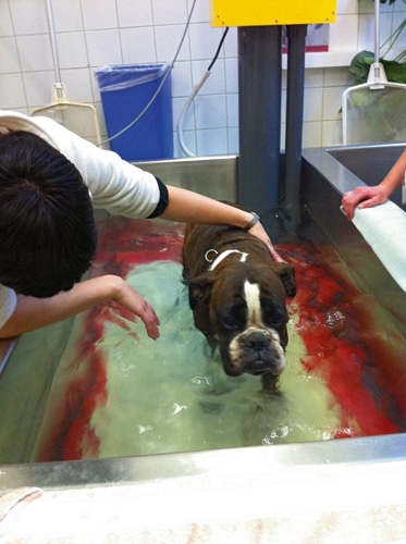 Aurora lernt das Unterwasserlaufband lieben und steigt jedes Mal freiwillig in ihren „Wellnesspool" – nicht zuletzt dank der liebevollen und einfühlsamen Führung und Unterstützung aller Mitarbeiterinnen in der physiotherapeutischen Ambulanz. Langsam werden die Bewegungszeiten im Wasser gesteigert, und die Geschwindigkeit des Laufbandes stets Auroras Konstitution angepasst. Von höchster Bedeutung ist immer wieder die Feststellung, dass Aurora während der gesamten Zeit ihrer Erkrankung keinerlei Schmerzen verspürt. Dies wird bei jedem Besuch in der Klinik genauestens überprüft. Die Erkrankung selbst verläuft absolut schmerzfrei, und für die aufgrund des eingeschränkten bzw. veränderten Bewegungsmusters natürlich unvermeidlichen Verspannungen reicht neben Akupunktur und Massage eine sehr niedrig dosierte Schmerztherapie vollkommen aus.