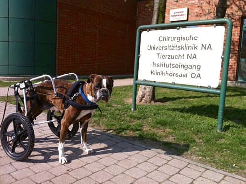 Wenige Wochen nach der vollständigen Lähmung der Hinterbeine verliert Aurora die Fähigkeit, selbstständig Harn und Kot abzusetzen. Es gibt sicher wenige Konstellationen, die ein Leben in dieser Situation noch möglich machen. Aurora und mir ist es vergönnt. Ihr ungebremster Lebenswille, mein unerschütterlicher Optimismus sowie das gesamte Ärzte- und Therapeutenteam der Universitätsklinik, wo wir während dieser Monate auf Händen getragen werden – gemeinsam machen wir das Unmögliche möglich.