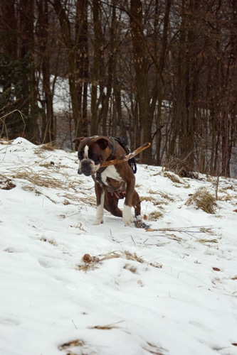 Voller Pläne und in grenzenlosem Optimismus starten Aurora und ich ins neue Jahr. Unternehmungslustig verbringen wir die ersten Januartage mit fröhlichen Waldspaziergängen. Wir sind beide überzeugt: Das wird ein tolles Jahr! Wer weiß, vielleicht das beste unseres Lebens. Wir sind voller Zuversicht, und tief in mir weiß ich, dass diese positive Aufbruchsstimmung, die uns beide beherrscht, in den kommenden Wochen und Monaten unser wichtigstes Kapital werden sollte. Trotz der unübersehbaren Ataxien in der Hinterhand sind noch Spaziergänge mit Spiel und Spaß möglich. Unsere abwechslungsreichen Unternehmungen führen uns noch immer an wunderschöne Orte des steirischen Vulkanlands, und vor allem an den Tagen unmittelbar nach der Physiotherapie bewegt Aurora sich so gerne, in ihrem Rahmen scheinbar so leicht und mühelos. Übermütig will sie in die weiße Winterpracht springen – ich bin glücklich über diese Lebensfreude und sehe im gleichen Moment, wie sie sich mit den unkoordinierten Bewegungen der Hinterbeine auf dem schneeglatten Untergrund nicht halten kann, hinfällt, und drei Meter die Böschung hinunterrutscht. Aber noch kann sie selbstständig wieder aufstehen. Fröhlich schwanzwedelnd kommt sie zu mir, fühlt sich sicher, scheint einfach glücklich, hier bei mir auf dieser Welt zu sein und lebt schon den neuen Moment. Die Sekunden davor waren vergessen.