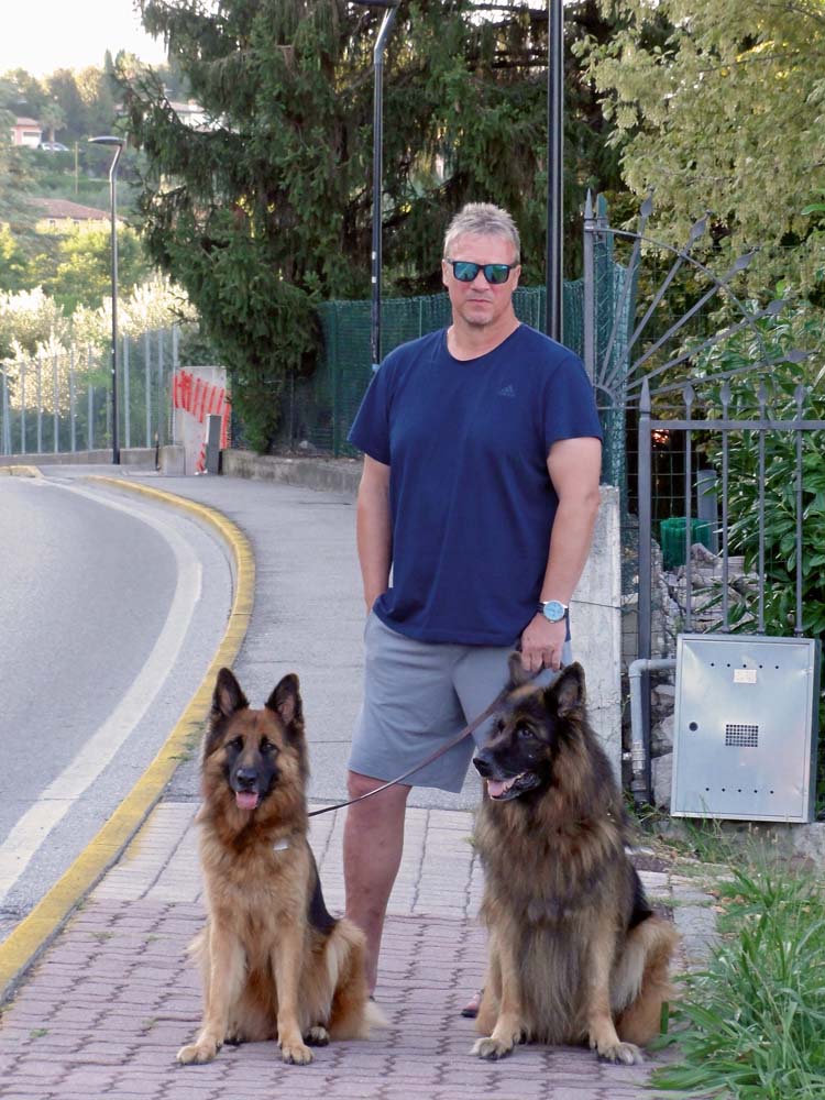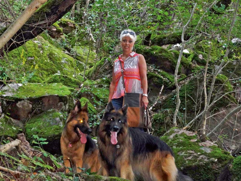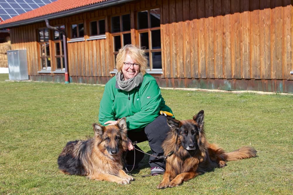 Corona und Lilli leben bei Christina Landmann und unterstützen sie bei ihrer Arbeit als Tierheilpraktikerin und Hundetrainerin. Christina Landmann über ihre zwei Schäfer-Damen: „Corona stammt aus einer bayrischen Zucht und ist jetzt 9 Jahre alt. Lilli haben wir vor 6,5 Jahren aus dem Tierheim geholt. Der Deutsche Schäferhund ist für mich der perfekte Begleiter, der sich durch angeborenen und angemessenen Wach- und Schutztrieb auszeichnet. So ruhig und unkompliziert sie im Haus sind, so begeistert sind sie beim Sport dabei. Begleithundeprüfungen, Obedience-Prüfungen und spielerische Unterordnung, gemixt mit Intelligenzspielen und kleinen Tricks, sind unsere Beschäftigungen. Lilli arbeitet zusätzlich noch als Therapiehund. Meine Ladys sind immer dabei und weit gereiste Globetrotter. Meine Erfahrungen haben gezeigt, dass Schäferhunde, die über die sogenannte „Harte-Hand“ erzogen wurden, vermehrt submissives Verhalten und Angstreaktionen bis hin zum Abschnappen zeigen. Ein Kreislauf ohne Ende, da der Halter ja dem Hund Fehlverhalten unterstellt und seine Methoden noch verschärft. Wenn ich meine Corona anschreien würde, würde sie auf den Hacken umdrehen und gehen. Und würde ich Lilli zu sehr einengen, würde sie als sehr charakterstarker Hund ihren Freiheitstrieb wahrscheinlich noch mehr ausleben. Konsequent aber fair und liebevoll, DAS ist die beste Ausbildung für den Deutschen Schäferhund.“.