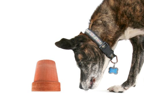Achtung: Verliert Ihr Hund das Interesse, heben Sie den richtigen Blumentopf schnell hoch und setzen ihn gleich wieder ab, damit er das Leckerli sieht.