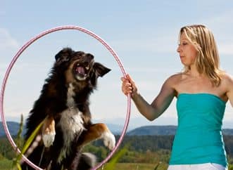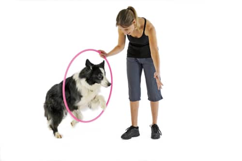 Achtung: Hunde haben den Dreh, durch einen Reifen zu springen, meistens sehr schnell heraus. Um Langeweile zu verhindern, erhöhen Sie am besten den Schwierigkeitsgrad (kleine Reifen; große Reifen; zwei Reifen …); selbst mit Ihren Armen können Sie jederzeit einen Kreis simulieren.