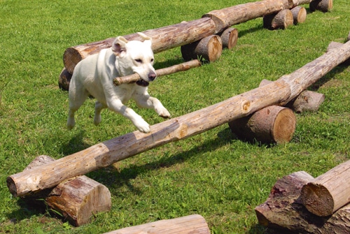 Diese Aufgabe zielt nicht darauf ab, Hunde über möglichst hohe Hürden springen zu lassen, sondern sie erst einmal mit den Hindernissen vertraut zu machen. Je niedriger Sie also anfangen, desto schneller wird Ihr Hund mit der Übung vertraut. Um eine Hürde zu errichten, bedarf es keiner Agility-Ausrüstung, sondern gefragt ist lediglich etwas Kreativität. So können zusammengerollte Decken, Blumenkisten oder Holzscheite ganz einfach als Hindernisse umfunktioniert werden. Die Hürdenhöhe bzw. die Größe des verwendeten Gegenstandes sollte an die Größe des Hundes angepasst werden. Für größere Rassen kann auch ein Besenstiel zwischen zwei Gartenstühlen befestigt werden.