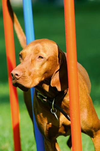 Der Slalom-Lauf ist durch die Agilitysportart bekannt geworden. Ihr Hund muss zwischen aufgestellten Stangen durchlaufen. Teure Trainingsausrüstung ist auch hierfür nicht nötig. Sie können als Slalomstangen einfache Bambusstangen aus dem Baumarkt oder Kunststoffstangen (für Pflanzen) verwenden und in die Erde stecken. Die Stangen sollten im Abstand von 50-65 Zentimetern aufgestellt werden. Auch hier gewinnt, wer langsam beginnt – verwenden Sie zunächst nur zwei Stangen. Geben Sie Ihrem Hund daraufhin ein Kommando (z.b. „Slalom“) und führen ihn zwischen den beiden Stangen durch – Belohnung nicht vergessen! Danach vermehren Sie die Stangenanzahl beliebig. Locken Sie ihn mit einem Leckerli hindurch, führen Sie ihn am Halsband oder der Kurzleine oder leiten Sie ihn einfach mit Ihrer Hand durch die Stangen.