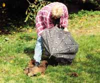 • Schirm liegt unaufgespannt am Boden, Hund wird hingeführt und gelobt, wenn er dieses Ding untersucht.