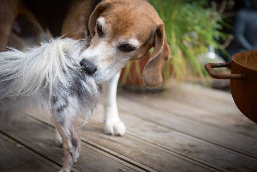 Häufig verläuft gerade die erste Hitze einer Hündin atypisch, da sie zu diesem Zeitpunkt körperlich noch nicht ganz fertig entwickelt ist und sich alles erst richtig einpendeln muss. Dann kann es zur sogenannten „stillen“ oder „weißen Hitze“ kommen, bei der trotz vorhandener hormoneller Vorgänge keine äußerlich sichtbaren Anzeichen auftreten. In einem solchen Fall kann die Hündin läufig werden, ohne dass man es bemerkt. Aber keine Sorge: Rüden werden es bemerken! Auch können vor allem bei jungen Hündinnen manchmal zunächst absolut typische Anzeichen der Läufigkeit auftreten, die dann aber nach wenigen Tagen wieder abklingen, bevor sie nach einem kurzen Intervall (Tage bis Wochen) erneut erscheinen. Diese Unregelmäßigkeit wird als „Split-Östrus“ bezeichnet. Genau genommen handelt es sich um einen doppelten Proöstrus, bei dem der erste nicht in einen Östrus mündet. Auch dieses Phänomen findet man oft bei jungen Hündinnen, die gerade ihre erste Hitze erleben.