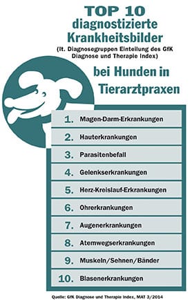 Die deutsche Gesellschaft für Konsumforschung (GfK) hat in einer Untersuchung die häufigsten Krankheiten bei Hunden und Katzen ermittelt. Das Ergebnis: An erster Stelle stehen Darmerkrankungen, gefolgt von Hautkrankheiten und Parasiten.