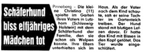 Das läßt aufhorchen! Lügt die Statistik und damit – sicherlich nicht beabsichtigt – Innenminister Buß? Wir erinnern uns doch noch an den schrecklichen Vorfall in Lutzhorn, bei dem am 6. August 2001, also im Berichtszeitraum von Innenminister Buß, die 11-jährige Kristina nicht von einem Mischling, sondern von einem Deutschen Schäferhund getötet (nach Aussagen eines Polizisten „regelrecht skelettiert“) wurde. Der Beamte Stefan Hinrichs von der Polizei Schleswig-Holstein West teilt in einer – unüblicherweise erst 1 Tag später (!) herausgegebenen – Presseerklärung das Unglück der Öffentlichkeit mit. In dieser offiziellen Erklärung ist von einem „3-jährigen Schäferhund“ die Rede. Gleiches berichtet dann auch die Deutsche Presseagentur dpa. WUFF hat den Fall seinerzeit genauer recherchiert und in der Ausgabe 9/2001 die Ergebnisse der Recherche veröffentlicht. In der folgenden Ausgabe 10/2001 behandelte WUFF darüber hinaus die Frage, warum die Zeitung „BILD“, die sonst alles, was nur irgendwie nach Hund (und da insbesondere „Kampfhund“) „riecht“, ins Schlaglicht auf die Titelseite zerrt, gerade diesen schrecklichen Todesfall eines Kindes aber gerade mal ganz klein auf Seite 8 bringt (siehe oben).